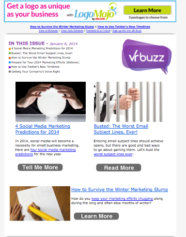 Once you get a feel for your readers’ behaviors and trends, use this to your advantage and refresh your newsletter design. Is your logo at the top large and pushing valuable content down? Make it smaller. Do your customers click on text links? Include clickable headlines, make them big(ger) or more prominent. Are your article sections lengthy? Make them smaller and use a template with no more than two columns per design to improve mobile viewing. Are text links not getting much love? Try including call to action buttons to each section instead, or in addition.