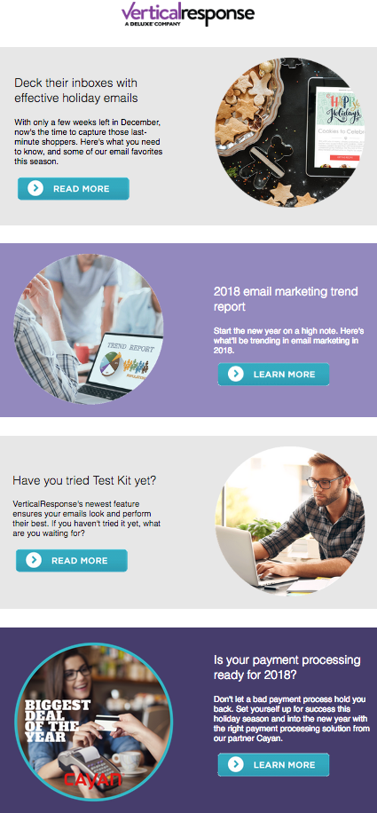 You should also keep your eye on what other companies are doing. Look in your own inbox and take note of what design elements work and are the most appealing to you. Design best practices are changing all of the time, and a template that you chose five years ago is likely to seem outdated to your current subscribers.